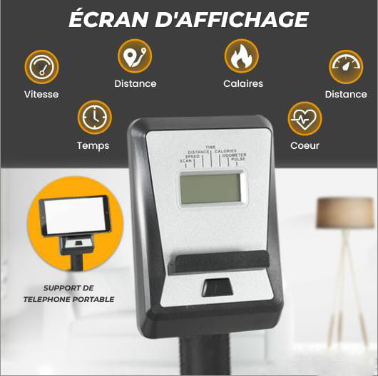 Écran affichage : La vitesse, le temps, la distance complète, la distance parcourue, les calories brûlées, les pouls, SCAN.